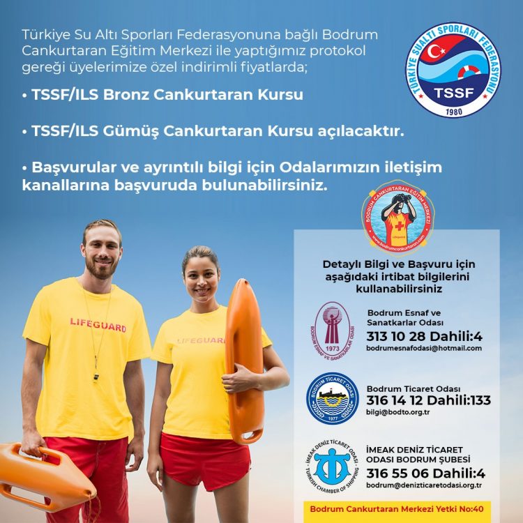 Bu sebeple, Bodrum Esnaf Ve Sanatkarlar Odası,Bodrum Ticaret Odası ve Bodrum Deniz Ticaret Odası işbirliğinde Bodrum genelinde üyelerimizin talepleri doğrultusunda oluşturulacak sınıflarda gümüş-bronz sertifikalı cankurtaran eğitimleri düzenlenecektir. Eğitim ücretlerinde üyelerimize özel indirimler sağlanmıştır. Cankurtaran eğitimleri, Türkiye Sualtı Sporları Federasyonuna bağlı faaliyet gösteren(TSSF) Bodrum Cankurtaran Merkezi Eğitmenlerince verilecektir.
